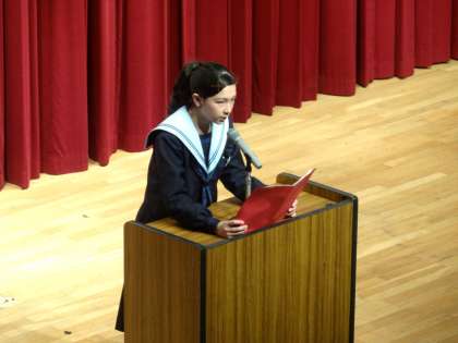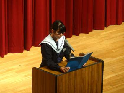 合唱コンクールの後は国語科の生活体験文・読書感想文発表です。各学年から代表者が1名ずつ選ばれました。3人とも文章の内容や話し方に説得力のある、堂々とした発表でした。写真は上から1年1組福西響子さんの「ペンは剣よりも強し」、2年1組増田あすかさんの「家族」、3年2組相馬志穂さんの「平和登校日」です。