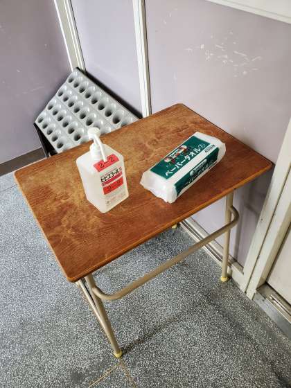 教室前には、消毒用アルコールを設置して生徒の入れ替わりごとに机などを消毒します。