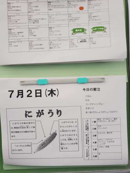 今日の献立は、ゴーヤチャンプルー、すまし汁、厚揚げのしょうがじょうゆかけ、ごはん、のり、牛乳、です。