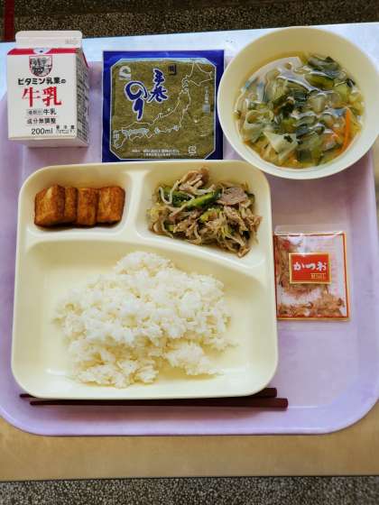 厚揚げは、かつお節を各自でかけていただきます。また、献立表には記載されていませんでしたが、これまでにつく予定であった手巻き用のりが本日の給食についています。