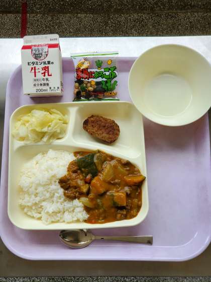 今日の献立は、夏野菜のカレーライス、焼きミニハンバーグ、キャベツのサラダ、豆こんぶ、牛乳です。