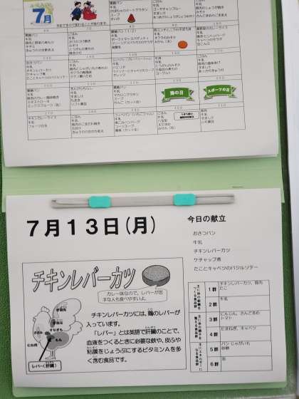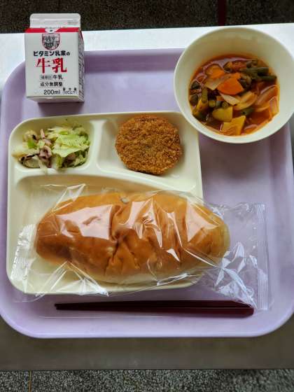 今日の献立は、チキンレバーカツ、ケチャップ煮、タコとキャベツのバジルソテー、おさつパン、牛乳です。