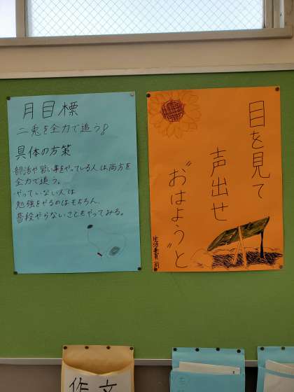 1枚は、今朝の全校集会で生徒会が呼びかけていた内容です。これまでよりも声を出してあいさつする生徒が多くなりました。声が出しにくい人は会釈だけでもしようと全校生徒に呼びかけていました。