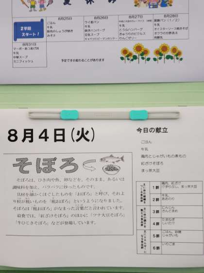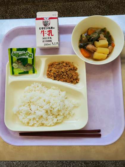 今日の献立は、鶏肉とじゃがいもの煮もの、紅ざけそぼろ、抹茶大豆、ごはん、牛乳です。