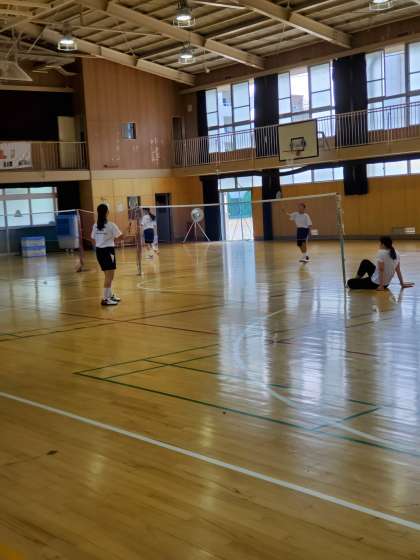 体育館では、バドミントン部が練習していました。バドミントンの羽根は、風に影響されやすいので、窓を閉めて練習することが多いのですが、窓を開けて扇風機で空気を動かしながら練習していました。