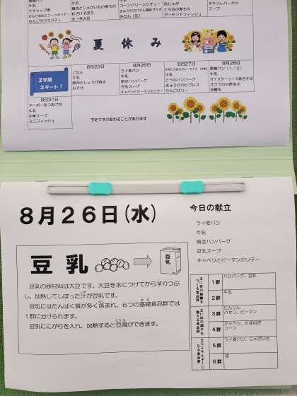 暑い時は、パンが喉を通りにくいと言う人も多いのではないでしょうか。今日の献立にあるスープだけでなく、ソテーやハンバーグと一緒に噛むことで食べやすくなるはずです。よく噛んでいただきましょう。
