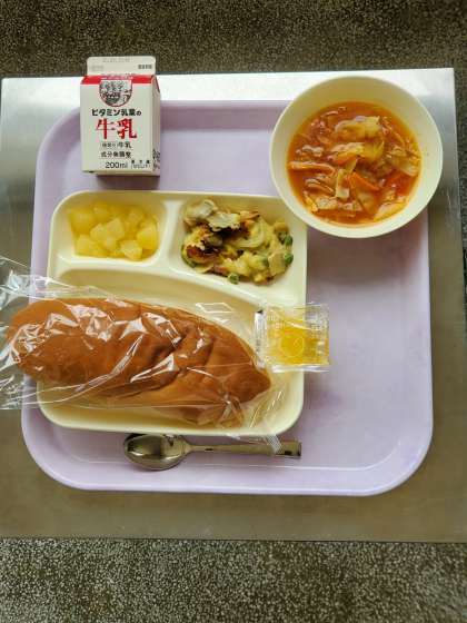 今日の献立は、豆乳マカロニグラタン、トマトスープ、洋なし(カット缶)、コッペパン、マーマレード、牛乳です。
