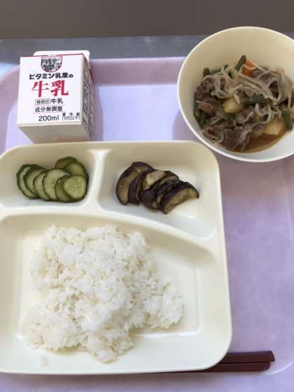 今日の献立は、肉じゃが、焼きなすのみそだれかけ、あっさりきゅうり、ごはん、牛乳です。