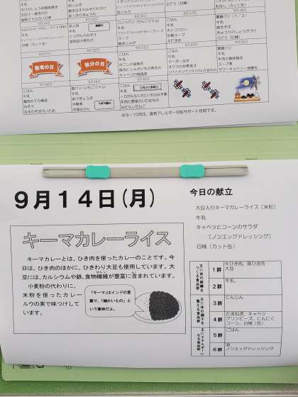 今日のキーマカレーライスには、蒸してひきわりにした大豆が入っていて、カルシウムや鉄分などが豊富に含まれています。