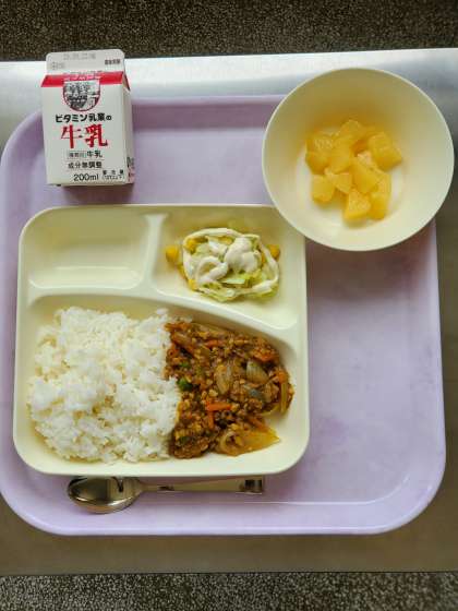 今日の献立は、大豆入りキーマカレーライス、キャベツとコーンのサラダ[ノンエッグドレッシング]、白桃(カット缶)、牛乳です。