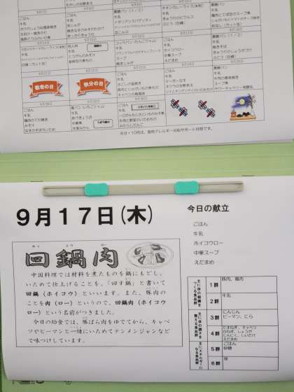 今日の給食カレンダーは、ホイコーロー(回鍋肉)について書かれています。中華料理では、一旦煮たものを鍋に戻して炒めて仕上げることから、ホイコー(回鍋)と書くそうです。