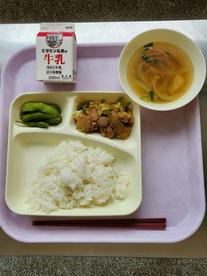 今日の献立は、ホイコーロー、中華スープ、枝豆、ごはん、牛乳です。