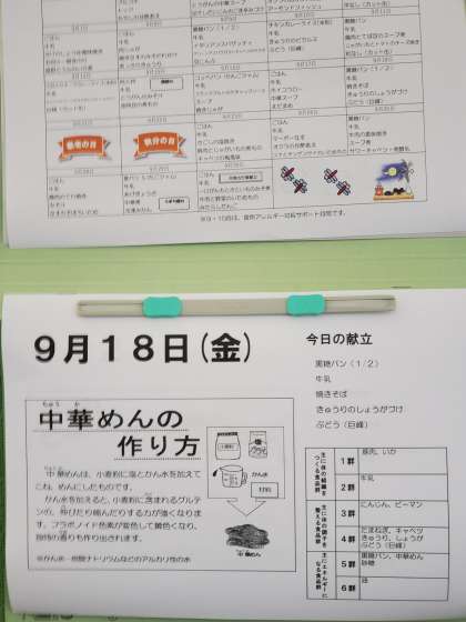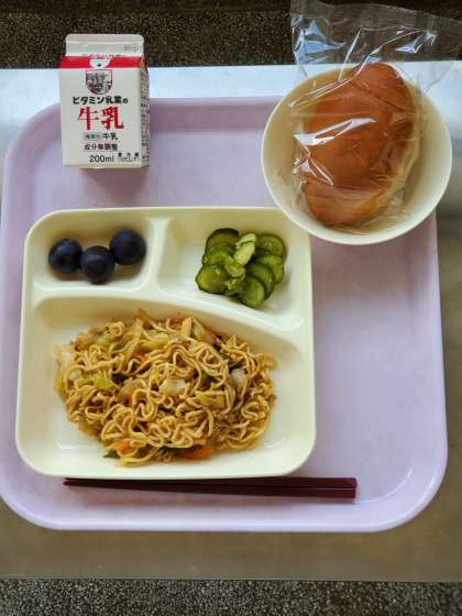 今日の献立は、焼きそば、きゅうりのしょうがづけ、ぶどう(巨峰)、黒糖パン(1/2)、牛乳です。