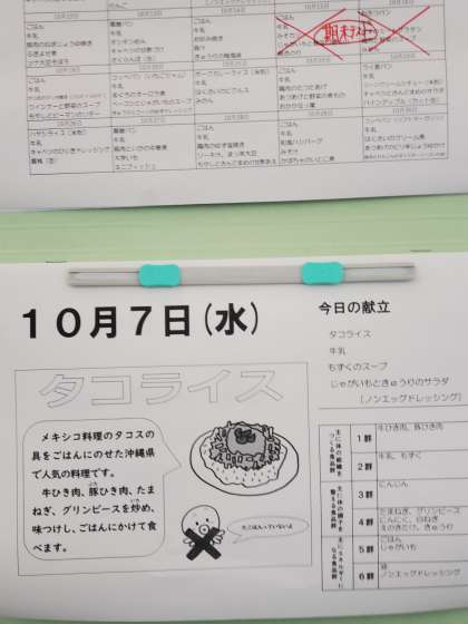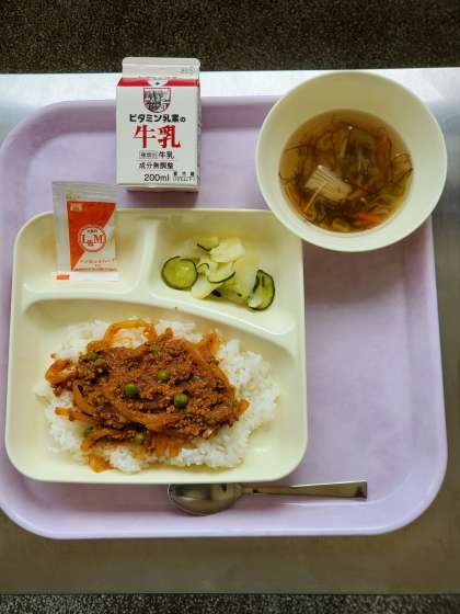 今日の献立は、タコライス、もずくのスープ、じゃがいもときゅうりのサラダ(ノンエッグドレッシング)、牛乳です。