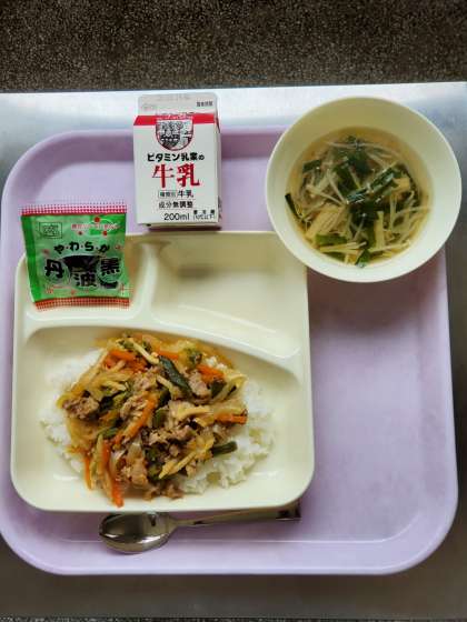 今日の献立は、ピリ辛丼、中華スープ、ソフト黒豆、牛乳です。