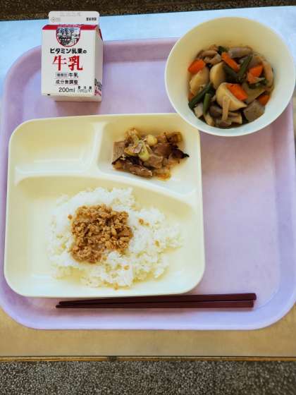 今日の献立は、豚肉のねぎじょうゆ焼き、ふきよせ煮、ツナ大豆そぼろ、ごはん、牛乳です。