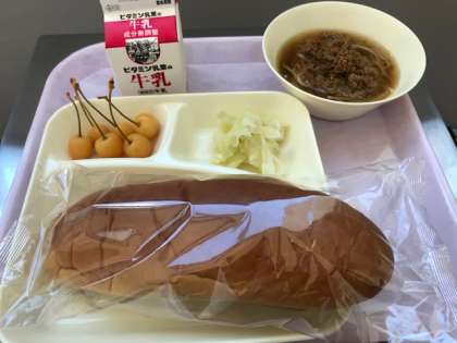 今日の献立は、タンタンめん、キャベツの甘酢づけ、さくらんぼ、