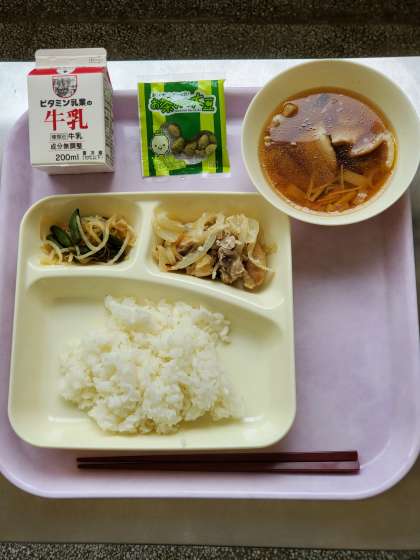 今日の献立は、鶏肉のゆず塩焼き、ソーキ汁、もやしと三度豆の甘酢あえ、まっ茶大豆、ごはん、牛乳です。