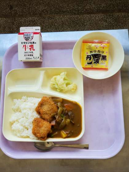 今日の献立は、カツカレーライス、カリフラワーのピクルス、いり黒豆、牛乳です。