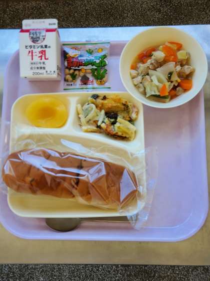 今日の献立は、スープ煮、ほうれん草のグラタン、白桃(缶)、レーズンパン、牛乳です。また、献立表には書いていませんが、大豆こんぶがつきます。