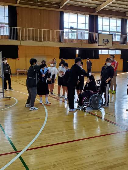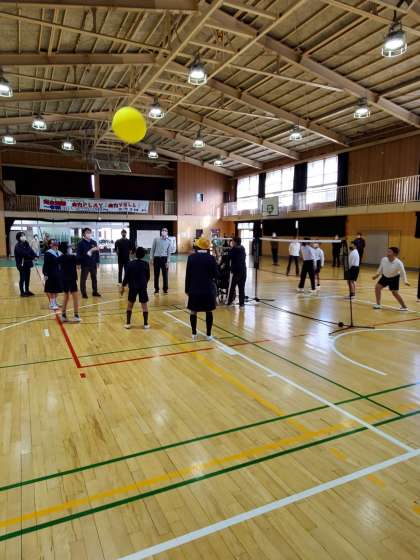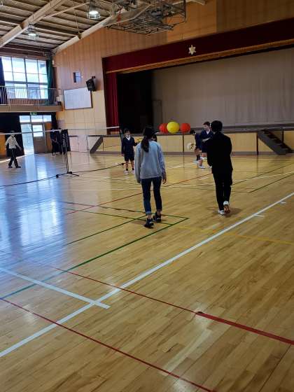 後半は、風船バレーボールを行いました。行方が定まらない風船を打つのは難しいですが、譲り合って打っていました。