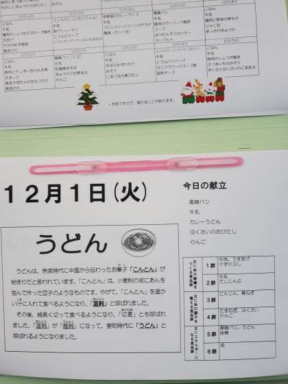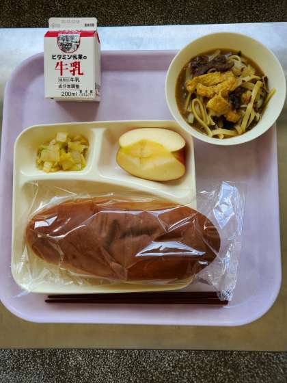 今日の献立は、カレーうどん、白菜のおひたし、りんご、黒糖パン、牛乳です。