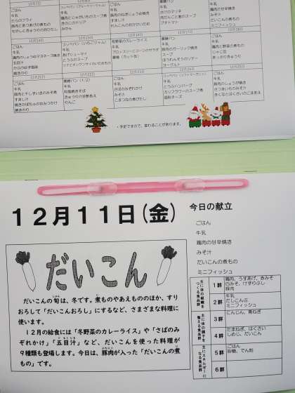 今日の給食カレンダーは、大根を記事にしています。冬野菜の大根は、鍋の具材になったり、大根おろしにしたりします。今日は、豚肉と一緒に煮ています。