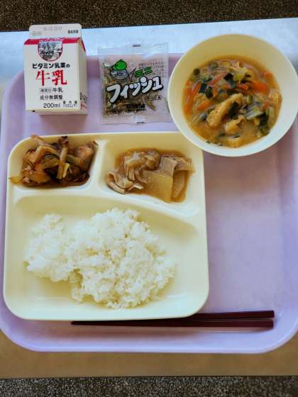 今日の献立は、鶏肉の甘辛焼き、みそ汁、大根の煮もの、ミニフィッシュ、ごはん、牛乳です。
