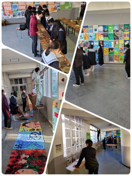 生徒は、24日に他学年相互の鑑賞を行いますが、明日からの進路懇談、学期末懇談でお越しいただいた保護者の方々にもみていただこうと、放課後に準備を行いました。