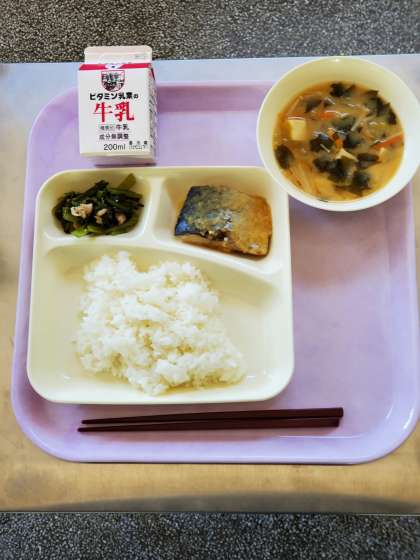 今日の献立は、サバのみぞれかけ、みそ汁、小松菜の煮びたし、ごはん、牛乳です。