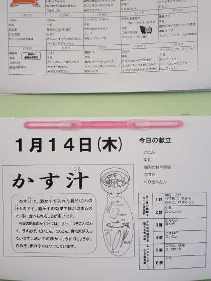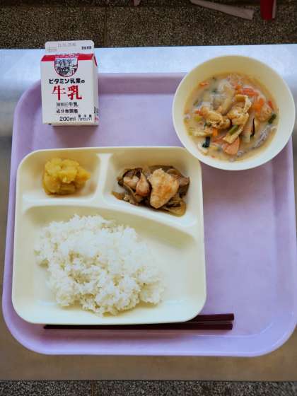 今日の献立は、鶏肉の甘辛焼き、かす汁、栗きんとん、ごはん、牛乳です。