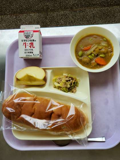今日の献立は、ミートボールと野菜のカレー煮、ツナとキャベツのソテー、りんご、おさつパン、牛乳です。