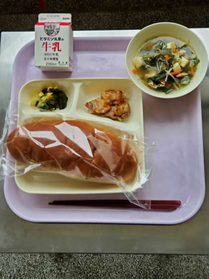 今日の献立は、鶏肉のオイスターソース焼き、中華スープ、チンゲン菜とコーンの中華あえ、黒糖パン、牛乳です。