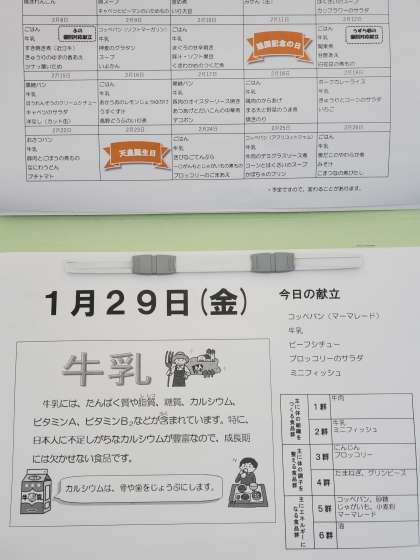 今日の給食カレンダーには、牛乳の栄養について書かれていました。栄養たっぷりの牛乳ですが、好き嫌いもあるでしょうし、この時期に冷たいのは困ると言う人もいるかもわかりませんね。給食の牛乳は、温めて提供することはできません。冷たい牛肉が苦手と言う人や寒い時などは、いつもより口に含んでいる時間を長くとるのも飲みやすくする1つの方法です。