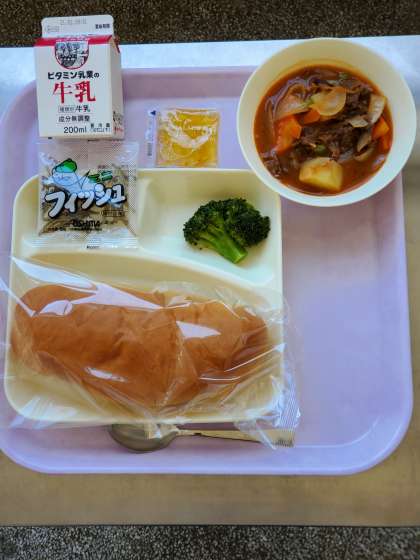 今日の献立は、ビーフシチュー、ブロッコリーのサラダ、ミニフィッシュ、コッペパン、マーマレード、牛乳です。