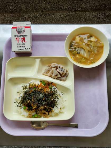 今日の献立は、鶏ごぼうご飯、みそ汁、焼きれんこん、牛乳です。