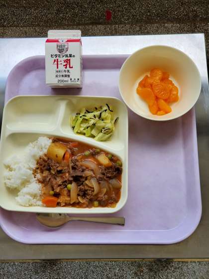 今日の献立は、ハヤシライス、キャベツのひじきドレッシング、みかん(缶)、牛乳です。