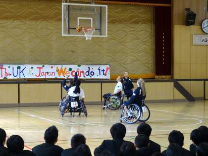 2月10日(火)の5、6限、体育館で1・2年生対象に車いすバスケットボール親善交流会がありました。イギリス女子のチームのみなさんが来てくださいました。生徒会の谷岡くんの司会で交流会が始まり、続いて溝渕さんから歓迎の言葉がありました。選手の自己紹介のあとは、いよいよ交流会の始まりです。選手によるデモンストレーションを見て、車いすの素早い動きと迫力に驚きました。