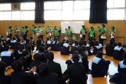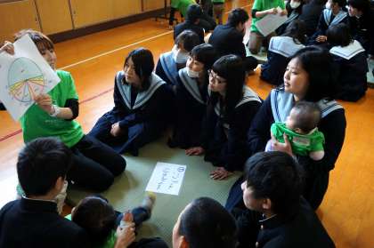 3月13日(金)5限目、2年生を対象にした「赤ちゃん先生」体験授業がありました。目の前の赤ちゃんの愛らしさに、生徒たちは大変な盛り上がりです。女子はもちろんのこと、少し照れくさそうにしていた男子も次第に自分から赤ちゃんとふれ合うようになりました。一人ずつ抱っこしたり、みんなで「げんこつやま」や「いないいないばあ」をしたり、小さな命とふれあう45分間はあっという間に過ぎてしまいました。