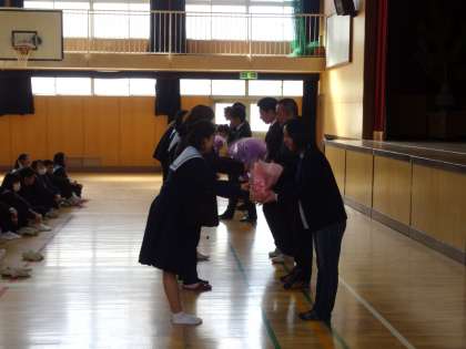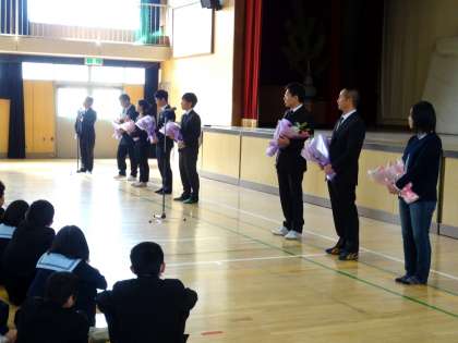 中岡校長先生をはじめ、7名の教職員が野田中学校を去られます。その先生方から、一言ずつ挨拶があった後、PTAの役員の方や生徒たちから花束が手渡されました。