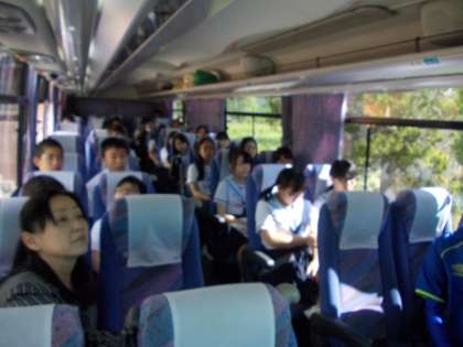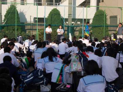 長島スパーランドで元気いっぱい遊んだあとは、バスに乗り込み、大阪方面へ。途中のトイレ休憩を挟んで、バスの中はちょっとウトウトする人も。みんなの口数も少なくなってきたころ、長かった高速を降り、すぐに見慣れた風景に変わってきました。学校に到着すると、多くの保護者の方や先生方に出迎えに来てくれていました。グラウンドに集合し生徒会の2人が、最後に挨拶をしてくれ、修学旅行で得た絆と課題を今後の学校生活にも生かしていくことを約束しました。