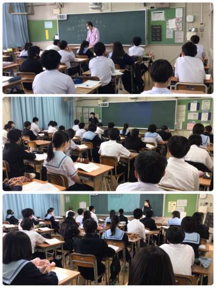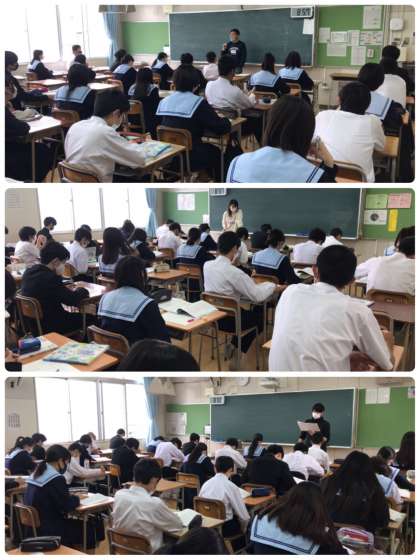 オンラインによる全校集会では、まず、校長先生から「いじめについて考える日」と題しての話があり、その後、生徒会が「いじめ問題撲滅宣言」を発表しました。