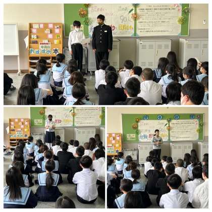 今日は、図書委員会から本の紹介と学級代表から一泊移住について、学年の先生から一泊移住に向けての話がありました。