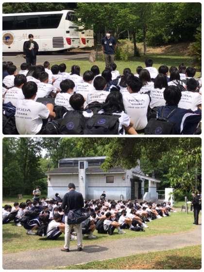 挨拶の後、センターの職員の方から、野外炊事についての説明を受けています。