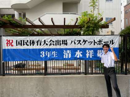 本校3年生の清水 祥敬 君が栃木県にて開催される第77回国民体育大会 バスケットボール競技に大阪府代表少年男子チーム選手として参加します。野田中学校藤友会、同窓会から横断幕を作成していただきました!