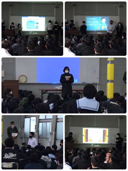 5限目はクラス内での発表を行い、その内容から2つの班をクラス代表として選出しました。6限目は各クラス代表の6つの班から発表をしました。