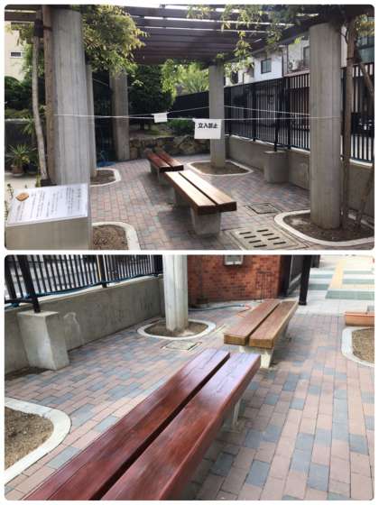 管理作業員の中田さんが、藤棚のベンチを補修してくださいました。ベンチ全体を磨いた上で、防水塗料を塗布していただいており、ピカピカになっています!