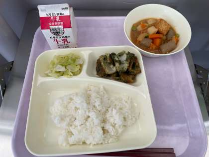 ちくわのいそべあげ、あつあげとさといものみそ煮、あっさりキャベツ、ごはん、牛乳です。