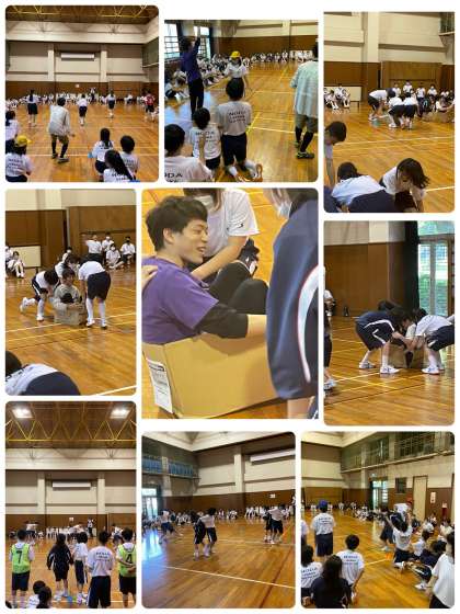 学級聖火リレー、背中合わせボールリレー、ダンボールリレーです。
