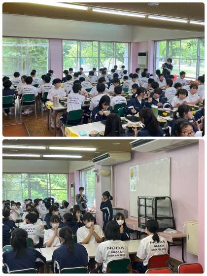 メニューは、そぼろかけ丼&きざみうどんです。最後に二日間おいしい食事を作っていただいた、調理員さんに感謝の気持ちを伝えました。